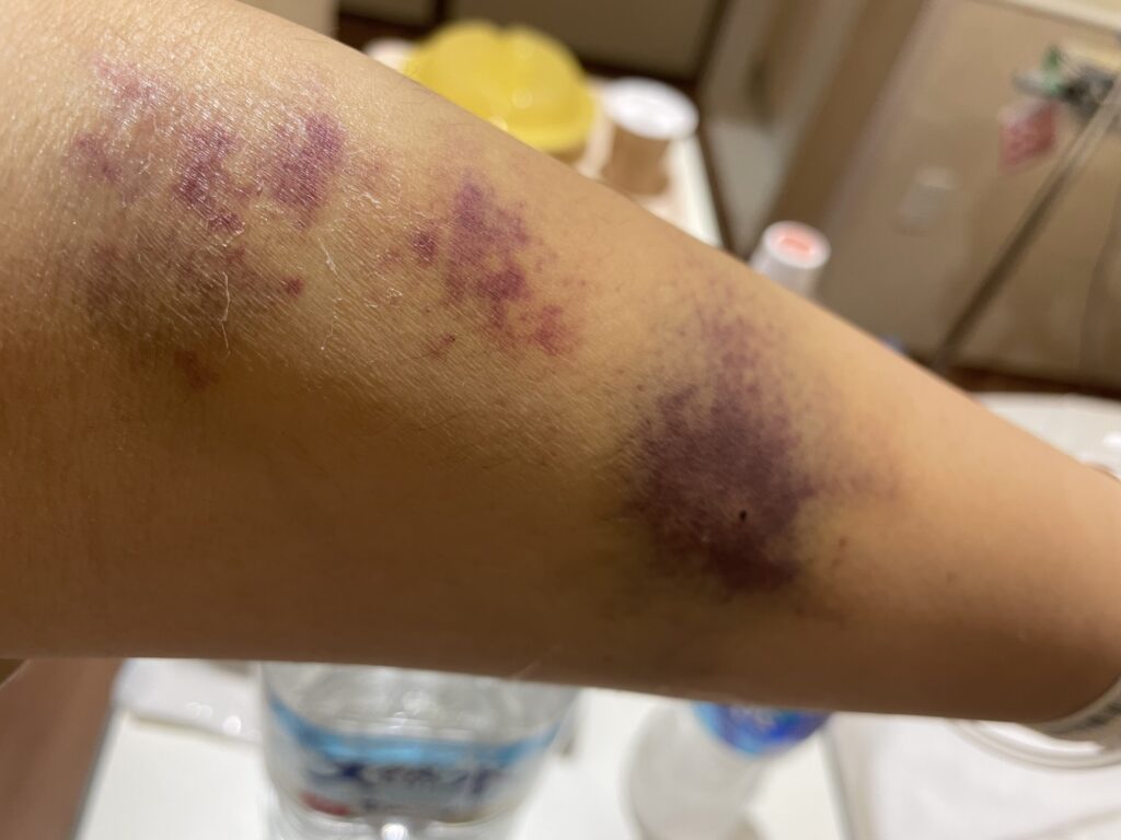 (入院中は、点滴と採血で、腕がずっとこんな状態でした)